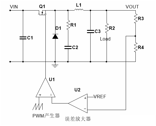 普通的buck變化器結(jié)構(gòu)如圖所示,VIN為DC輸入電壓,C1為輸入電容,Q1為MOSFET開關(guān),D1為buck結(jié)構(gòu)中必須的二極管,在同步降壓芯片中D1也是MOSFET,可以提高效率和降低成本。R1,C1不是必須的,RC吸收電路能提高EMI性能。L1為儲(chǔ)能電感,C3為輸出電容,R3,R4,U2,U1組成反饋環(huán)路,R3和R4設(shè)定輸出電壓。
