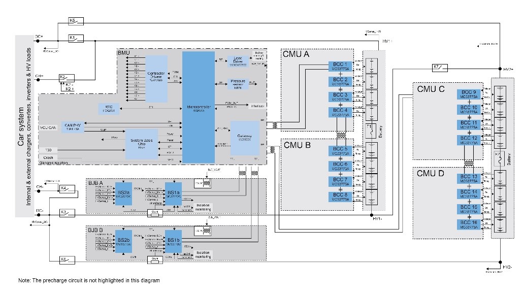 上圖顯示了電動汽車動力的關鍵系統(tǒng)。圖中為主高壓(HV)電池及其管理系統(tǒng)。低電壓(LV)側(cè)為鉛酸電池或鋰電池,電壓通常為12~14 V,可以提供車內(nèi)照明、門鎖、導航和駕駛輔助系統(tǒng)所需的較低電壓。12V電池還可作為備用電源,在主高壓電池無法供電的情況下接管關鍵安全功能,如轉(zhuǎn)向。