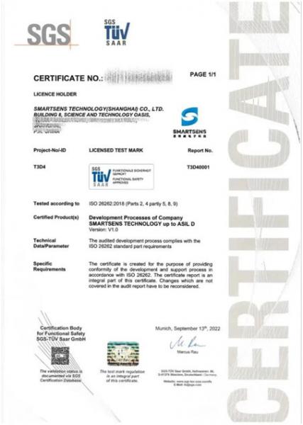 思特威已于本月8日成功獲得ISO 26262:2018汽車(chē)功能安全流程ASIL D認(rèn)證證書(shū),這也是思特威在精進(jìn)車(chē)規(guī)安全開(kāi)發(fā)體系與流程、打造先進(jìn)車(chē)規(guī)級(jí)芯片、推動(dòng)智能汽車(chē)行業(yè)高質(zhì)量發(fā)展等方面取得的實(shí)效。