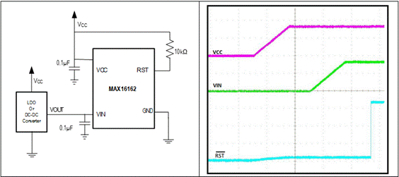 真正的無毛刺監(jiān)控器可以通過復(fù)位吸入電流,即使當(dāng)VCC為零時(shí)也會(huì)將復(fù)位引腳強(qiáng)制拉到接地電位。圖6顯示了一種真正無毛刺監(jiān)控器的示例電路。ADI的MAX16161/MAX16162無需任何外部組件即可實(shí)現(xiàn)無毛刺工作,小巧且經(jīng)濟(jì)。