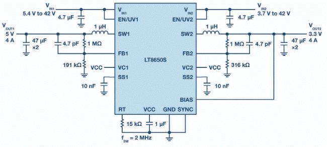 圖1.簡(jiǎn)化的LT8650S原理圖在2 MHz時(shí)提供5 V/4 A輸出和3.3 V/4 A輸出。
