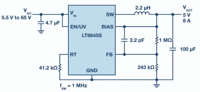 圖3.簡(jiǎn)化的LT8645S原理圖,在2 MHz時(shí)提供5 V/8 A輸出。
