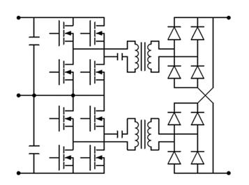 帶有次級(jí)同步整流拓?fù)浣Y(jié)構(gòu)的DAB-ZVT轉(zhuǎn)換器也非常典型。這些都是用PWM工作,一般來說,需要比LLC轉(zhuǎn)換器更簡(jiǎn)單的控制。DAB可以被認(rèn)為是傳統(tǒng)的全橋移相ZVT轉(zhuǎn)換器的演變,但漏電感器在初級(jí)端,這簡(jiǎn)化了繁瑣的次級(jí)端整流,減少了二次開關(guān)或二極管的必要額定擊穿電壓。由于實(shí)現(xiàn)了ZVT,這些轉(zhuǎn)換器可以在很寬的輸出電壓范圍內(nèi)提供穩(wěn)定的高能效。這對(duì)于支持800 V和400 V電池電壓水平的充電器來說是個(gè)方便的因素。DAB的PWM工作帶來了好處。首先,它傾向于使轉(zhuǎn)換器的電磁干擾(EMI)頻譜比調(diào)頻系統(tǒng)中的更緊密。此外,用固定的開關(guān)頻率,系統(tǒng)在低負(fù)載時(shí)的行為更容易解決。通過同步整流,DAB是一種雙向的原生拓?fù)浣Y(jié)構(gòu),是快速電動(dòng)汽車充電器的最通用的替代方案和合適的解決方案之一。