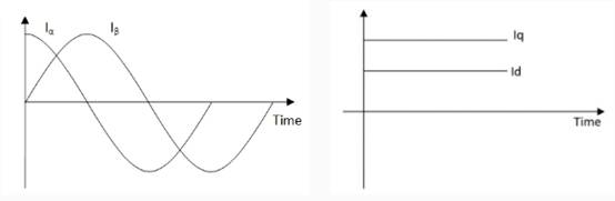 圖1:用克拉克變換(Iα和Iβ)投影三相電流,然后通過帕克變換投影到線性d,q旋轉參照坐標系