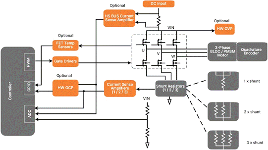 圖2顯示了使用正交編碼器的有傳感器FOC實施所需的信號。反饋至少需要1-3個電流檢測輸入(取決于分流架構)到ADC和正交A/B/Z信號的3個GPIO引腳。還必須為編碼器供電。