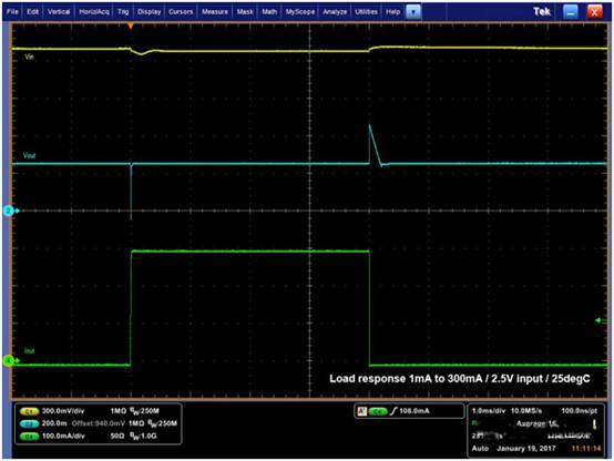 01由于有限的控制回路速度,負(fù)載電流的快速變化會導(dǎo)致輸出電壓的變化。有時因?yàn)闀r間延遲,內(nèi)部調(diào)節(jié)回路無法對電流的快速變化作出反應(yīng),就會導(dǎo)致通常約為幾十毫伏的下沖/過沖。