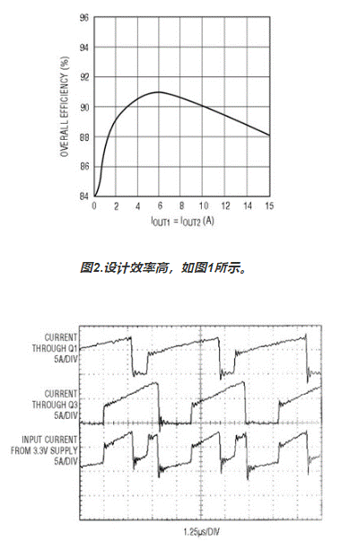 圖1.LTC1876 設(shè)計可在 15A 和 15A 時將 3.3V 轉(zhuǎn)換至 2.5V,在 15A 時轉(zhuǎn)換 1.8V。