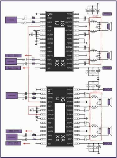 3、IU5706支持12V升壓至24V,給兩顆IU8689供電,輸出4x65W/4歐 ( THD+N=1%);IU8689主從模式可實(shí)現(xiàn)多顆芯片無限級聯(lián)功率輸出,此應(yīng)用非常適合車載音頻后裝市場。