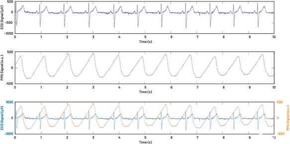 集成了時間戳功能,以支持來自多個連接傳感器的數(shù)據(jù)樣本之間的同步。一旦使用多個傳感器數(shù)據(jù)來查找各種測量結果之間的相關性,就需要這樣做。圖2顯示了如何使用該芯片測量與光電容積脈搏波(PPG)測量同步的ECG;诿}沖傳輸時間(PPT)測量技術,可以在連續(xù)模式下測量血壓。這對高血壓患者非常有吸引力。時間戳功能使這成為可能。