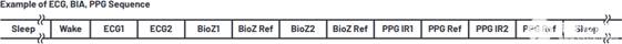 圖 3b 顯示了一個操作序列的示例。上電后,進行復位操作,芯片進入休眠模式。喚醒芯片后,您可以依次對兩個ECG信號(例如,LEAD I和LEAD II)進行采樣,然后進行光學測量以執(zhí)行SpO2讀數(shù)和阻抗測量以測量皮膚電導率(EDA/壓力)。下一節(jié)將解釋實現(xiàn)這些測量中的每一個的過程。