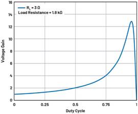 所以,RL和RLOAD的比值會(huì)影響可能的輸入和輸出電壓之間的比值,進(jìn)而影響升壓轉(zhuǎn)換器的電壓增益。該電壓增益可以如圖所示。圖2所示的示例中,輸入電壓為24V,輸出電壓為300V,電流為160mA,負(fù)載電阻為1.8kΩ,電感RL的DCR為3Ω。