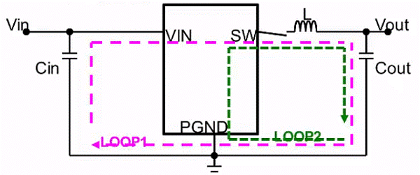 下圖中紅色LOOP1為DC-DC高邊管導(dǎo)通,低邊管關(guān)閉時(shí)的電流流向;綠色LOOP2的為高邊管關(guān)閉,低邊管開啟時(shí)的電流流向;