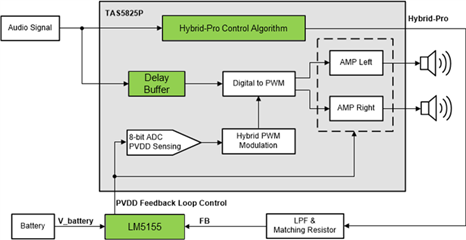 TAS5825P為德州儀器2019年新推出的數(shù)字輸入D類功放芯片。該芯片內(nèi)置強(qiáng)大的音頻 DSP 內(nèi)核,實(shí)現(xiàn)了一種稱為 Hybrid-Pro 的專有算法。Hybrid-Pro算法可檢測即將發(fā)生的音頻功率需求,并通過反饋引腳 (HPFB) 為DC/DC變換器提供 PWM 控制信號來調(diào)整輸出電壓(即D類功放的電源電壓 PVDD)。TAS5825P 支持高達(dá) 4ms 的延遲緩沖器 (Delay Buffer),以提前查看音頻信號并防止音頻削波失真。