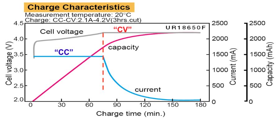 使用類似BQ4725A這類集成的充電管理芯片方案對(duì)鋰電池充電其實(shí)十分簡(jiǎn)單。鋰電池直接連接到充電控制芯片BQ24725A的BAT管腳上,配置充電控制芯片的Charge Voltge,Charge Current,以及保護(hù)功能的Input Current Limit,使能充電功能即可。Charge Voltage(VCHG)是電芯的最大滿充電壓,Charge Current (ICHG) 是電芯允許的最大充電電流。典型的鋰電池充電特性如下圖所示,分為CC(Constant current)和CV(Constant Voltage) 兩個(gè)階段。CC階段恒定以最大充電電流持續(xù)對(duì)電池進(jìn)行充電,此時(shí)單位時(shí)間充入電池的電量是恒定的Q=ICHG*T。隨著電池充入電量越來越多,電池電壓會(huì)上升,當(dāng)電壓上升到最大滿充電壓時(shí)候,充電芯片將控制輸出電壓為恒定的最大滿充電壓,此時(shí)電流開始逐漸減小,充入電量的增加速度慢慢減慢,總充入電量仍然在增加。直到電流減小到截止電流點(diǎn),充電芯片停止充電,鋰電池達(dá)到充滿狀態(tài)。