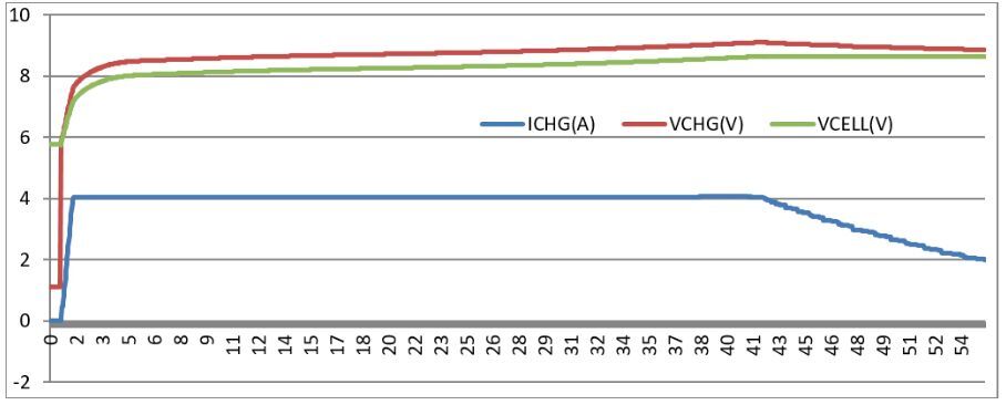 基于這個(gè)管理過程,使用充電芯片BQ24725A對(duì)一塊對(duì)講機(jī)電池(滿充電壓8.8V)進(jìn)行充電,并記錄下充電過程中的VCHG, ICHG和VCELL(電芯側(cè)的電壓)。下圖所示為基于橫坐標(biāo)的充電時(shí)間(分鐘)對(duì)應(yīng)的各個(gè)參數(shù)的變化趨勢(shì),可以看到在不到第五分鐘,VCHG就達(dá)到最大值,ICHG就從峰值的4A電流開始下降,經(jīng)歷了從CC區(qū)間到CV區(qū)間的切換。最大充電速率的CC階段4A充電持續(xù)時(shí)間很短,可以預(yù)料,如果要對(duì)這塊電池完全充滿,CV區(qū)間將耗費(fèi)很長(zhǎng)的時(shí)間。