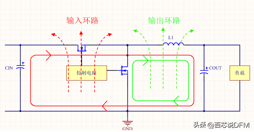 DC-DC芯片布板需遵循一個非常重要的原則,即開關(guān)大電流環(huán)路面積盡可能小。下圖所示的BUCK拓補(bǔ)結(jié)構(gòu)中可以看到芯片開關(guān)過程中存在兩個大電流環(huán)路。紅色為輸入環(huán)路,綠色為輸出環(huán)路。每一個電流環(huán)都可看作是一個環(huán)路天線,會對外輻射能量,引起EMI問題,輻射的大小與環(huán)路面積呈正比。