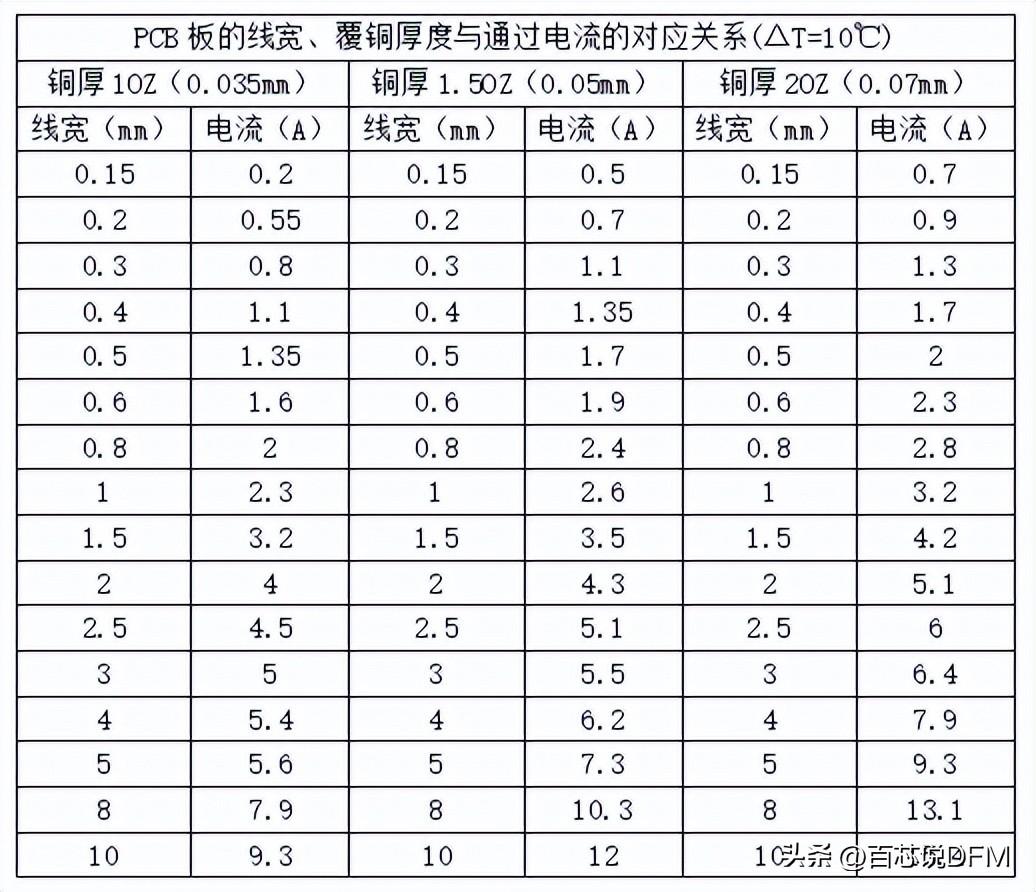附上溫升10℃時,PCB板的線寬、覆銅厚度與通過電流的對應(yīng)關(guān)系供參考。
