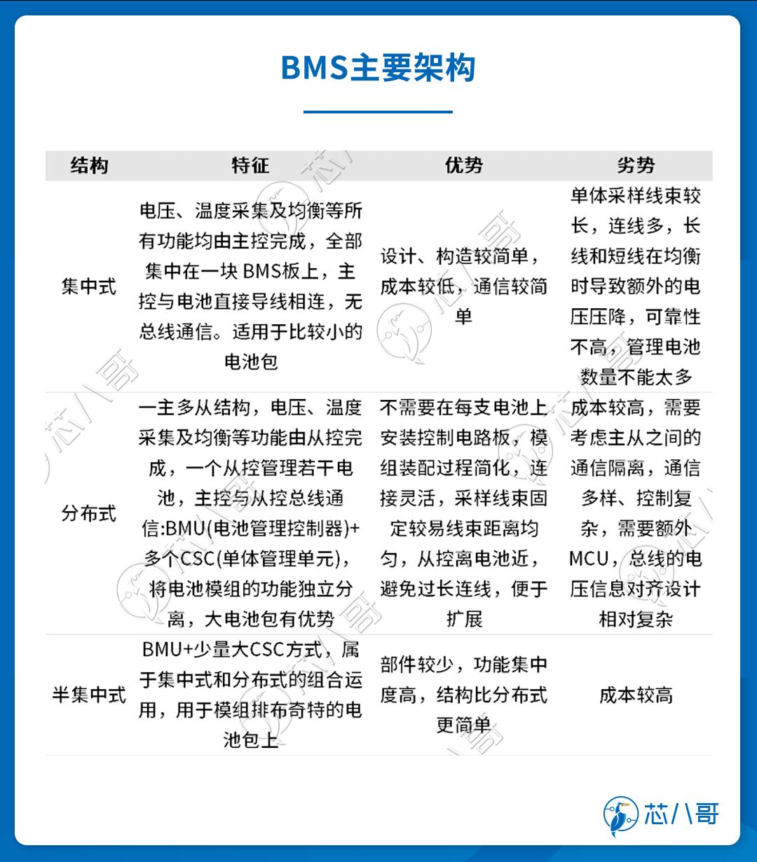其中,集中式BMS能將所有電芯統(tǒng)一用一個(gè)BMS硬件采集,具有成本低、結(jié)構(gòu)緊湊、可靠性高的優(yōu)點(diǎn),一般常見(jiàn)于容量低、總壓低、電池系統(tǒng)體積小的小電池包場(chǎng)景中;分布式BMS采用一主多從結(jié)構(gòu),電壓、溫度采集及均衡等功能由從控完成,一個(gè)從控管理若干電池,主控與從控總線通信采用BMU(電池管理控制器)+多個(gè)CSC(單體管理單元)的結(jié)構(gòu),能夠?qū)㈦姵啬=M的功能獨(dú)立分離;而半集中BMS則采用BMU+少量大CSC方式,屬于集中式和分布式的組合運(yùn)用,用于模組排布奇特的電池包上。
