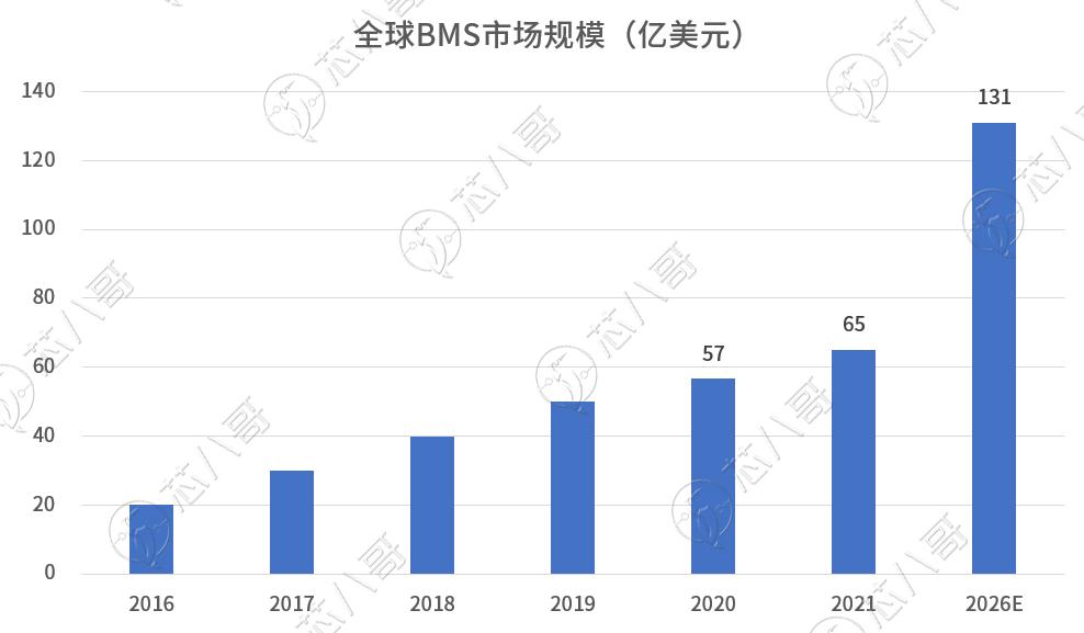 據(jù)前瞻產(chǎn)業(yè)研究院的數(shù)據(jù),2021年全球BMS市場(chǎng)規(guī)模預(yù)計(jì)為65.12億美元,至2026年預(yù)計(jì)可達(dá)131億美元,CAGR為15%。我國(guó)BMS 2021年市場(chǎng)需求規(guī)模為100億元,未來(lái)隨著電動(dòng)汽車(chē)市場(chǎng)規(guī)模擴(kuò)大和電池效率要求提高,BMS市場(chǎng)規(guī)模有望實(shí)現(xiàn)穩(wěn)定增長(zhǎng)。