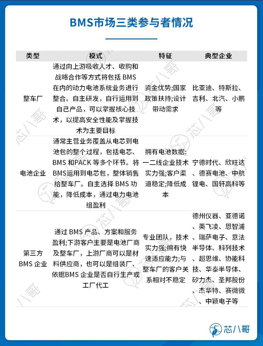 目前,BMS 市場(chǎng)主要有整車(chē)廠商、電池廠商、第三方廠商三類企業(yè)參與。三者各有優(yōu)劣和側(cè)重,都希望抓住“雙碳”背景下,能源轉(zhuǎn)型帶來(lái)的巨大的發(fā)展機(jī)會(huì)。