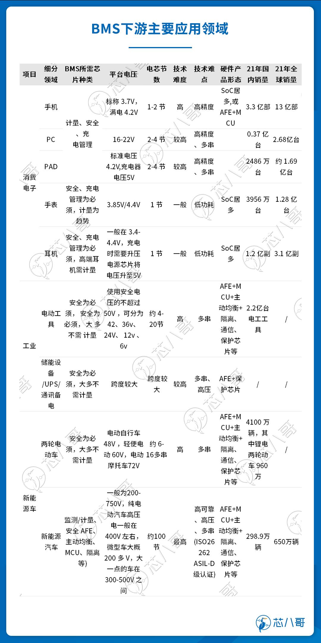 在消費(fèi)電子市場(chǎng),手機(jī)、PC、PAD、手表、耳機(jī)等產(chǎn)品以低串?dāng)?shù)(1-4串)的產(chǎn)品為主,BMS在其中發(fā)揮計(jì)量、安全、充電管理等功能,硬件產(chǎn)品形態(tài)以SoC居多。