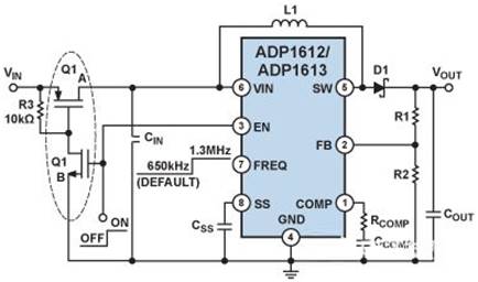 升壓轉換器使用電壓或電流反饋來調節(jié)所選輸出電壓;控制環(huán)路使輸出能夠保持調節(jié)以響應負載變化。低功耗升壓穩(wěn)壓器的工作頻率通常在600 kHz至2 MHz之間。較高的開關頻率允許使用更小的電感器,但開關頻率每增加一倍,效率就會下降約2%。在ADP1612和ADP1613升壓轉換器(見附錄)中,開關頻率可通過引腳選擇,工作頻率為650 kHz以實現最高效率,工作頻率為1.3 MHz以實現最小的外部元件。將 FREQ 連接到 GND 以實現 650kHz 操作,或連接到 VIN 以實現 1.3-MHz 操作。