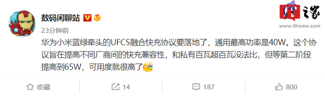 據微博博主 @數碼閑聊站 稱,華為、小米、OPPO、vivo 牽頭的 UFCS 融合快充協(xié)議要落地,通用最高功率是 40W。該協(xié)議旨在提高不同廠商間的快充兼容性,和私有百瓦超百瓦無法比較,但第二階段會提高到 65W,可用度將變高。