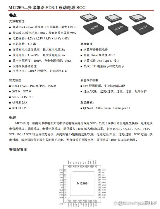 除了M12269這款明星產(chǎn)品外,MERCHIP水芯電子還推出了從22.5W-140W的完整快充充放電平臺。該系列芯片中的M12239等芯片可以支持兩路獨立快充,實現(xiàn)筆記本和手機同時快充。也可以多顆芯片并聯(lián)輕松實現(xiàn)多口快充充放電的復(fù)雜系統(tǒng)設(shè)計。該芯片家族包括以下成員: