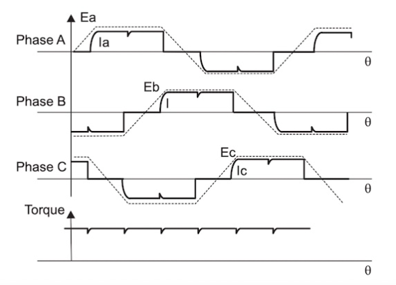 梯形控制的工作原理是,在任何給定時間都有兩個相位。因此,如上所示,在任何相位的過零期間都不會產(chǎn)生扭矩。