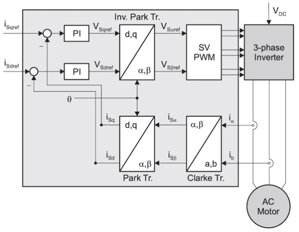 三相逆變器的輸出產(chǎn)生正弦信號,該信號通過克拉克變換和派克變換進行采樣和饋送。