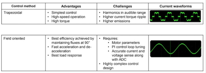 用于控制無刷直流電機的兩種控制方案各有優(yōu)缺點。每種方法都會產(chǎn)生諧波,從而產(chǎn)生噪聲。