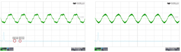 在MCF8316A內部啟用死區(qū)時間補償可消除可聽諧波(左),從而產(chǎn)生更純凈的正弦信號(右)。