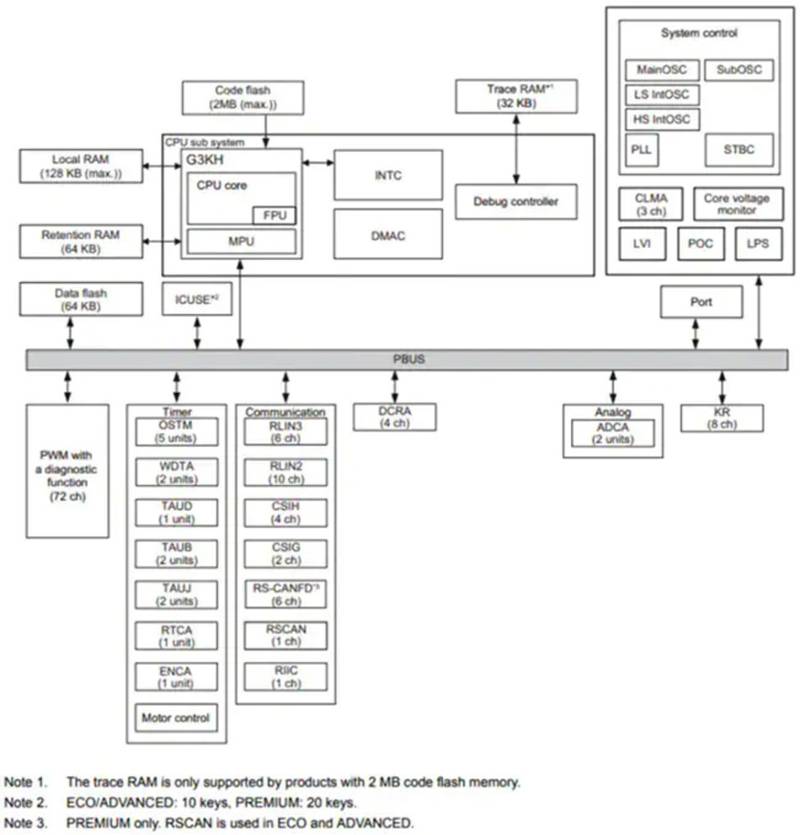 圖4:RH850/F1K芯片框圖 (圖源:貿(mào)澤電子)