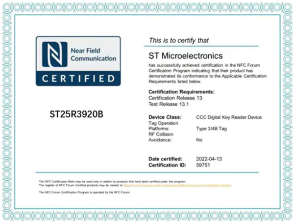 圖5:ST25R3920B獲得NFC Forum CR13認(rèn)證 (圖源:ST官網(wǎng))