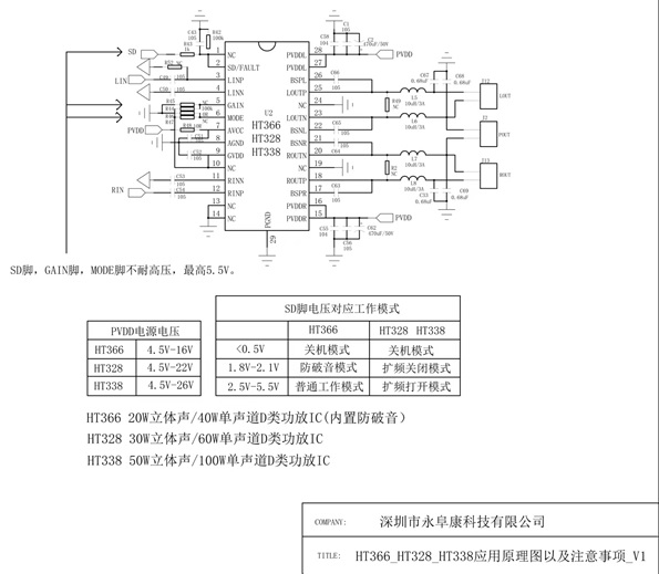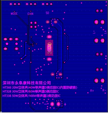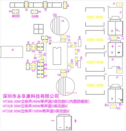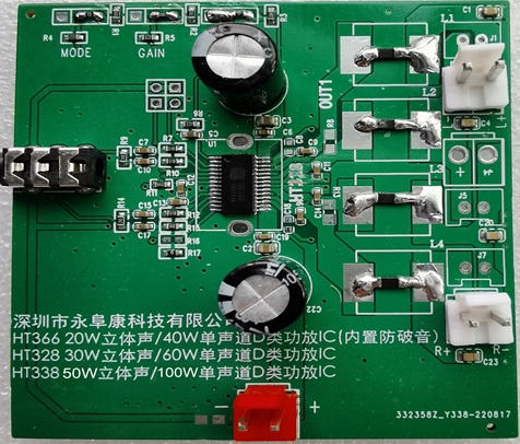 深圳市永阜康科技有限公司大力推廣最新20W、30W、50W雙聲道D類功放IC系列-HT366/HT328/HT338,可充分滿足藍(lán)牙音箱、聲霸音箱、便攜式音頻播放器及液晶電視 (LCD TV) 等應(yīng)用。工作電壓范圍覆蓋4.5V-26V,全系列產(chǎn)品管腳兼容,工程師可透過重復(fù)使用同一PCB不同功率無縫切換,以節(jié)省成本及縮短開發(fā)周期。