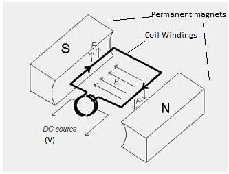 直流電機(jī): 簡(jiǎn)單的直流電機(jī)在軸上使用線(xiàn)圈繞組,帶有固定的永磁體(圖 2)。當(dāng)電壓 (V) 施加到線(xiàn)圈時(shí),電流 (i) 流過(guò)它。由于存在磁場(chǎng) (B),力 (F) 作用在線(xiàn)圈上(根據(jù)弗萊明斯右手定則),使其旋轉(zhuǎn)。一旦線(xiàn)圈到達(dá)永磁體的一個(gè)磁極,它就會(huì)受到排斥力并向另一個(gè)磁極移動(dòng)。這涉及連續(xù)旋轉(zhuǎn),其速度由施加的直流電壓決定。
