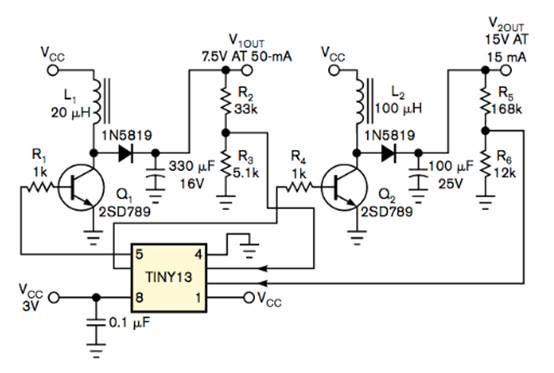 圖 2 Atmel Tiny13 AVR 微控制器使用其內(nèi)部 ADC 和 PWM 調(diào)節(jié)兩個升壓直流/直流轉(zhuǎn)換器輸出。