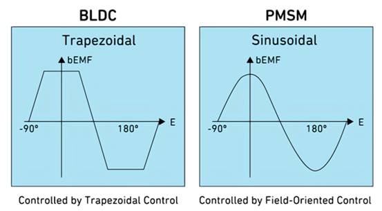 永磁同步電機和無刷直流電機之間的區(qū)別主要在于其定子繞組的形狀,以及由此產(chǎn)生的反電動勢波形特性(參見圖3)。
