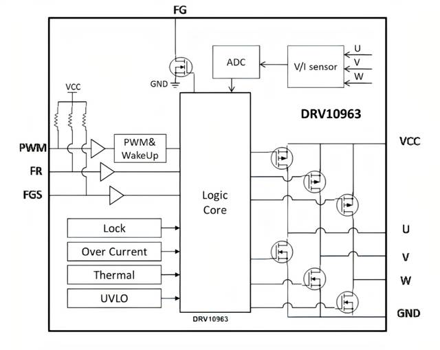 圖5所示為一個低功率無傳感器三相BLDC電機驅動器TI DRV10963的功能框圖,該IC包含三個功率MOSFET,適合于最高5V/0.5A的BLDC電機,可用于驅動筆記本電腦和高性能處理器上使用的冷卻風扇。DRV10963具有短路和過流保護功能,通過多路復用模數(shù)轉換器(ADC)監(jiān)測每個MOSFET的電流和電壓。PWM輸入可以用來控制并達到期望的電機速度!癋R”輸入允許在啟動時改變電機方向,“FG”輸出提供電機速度信息。