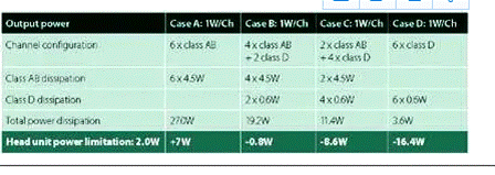 使用六個(gè) AB 類放大器通道將導(dǎo)致總功耗為 27W——比通常認(rèn)為的音響主機(jī)的值多 7W,如表中的 A 所示。