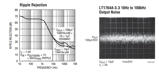PSRR衡量電路抑制電源輸入端出現(xiàn)的外來信號(hào)(噪聲和紋波),使這些干擾信號(hào)不至于破壞電路輸出的能力。在實(shí)際場(chǎng)景中越是低頻的噪聲越難抑制。在100 kHz 至 1 MHz 范圍內(nèi)的電源抑制非常重要,因?yàn)?LDO 經(jīng)常跟高效的開關(guān)電源配合使用來為敏感的模擬電路供電。