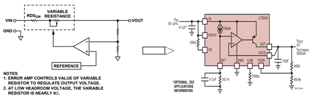 在芯片系列中有線性穩(wěn)壓器(LDO)和開關(guān)電源(DC/DC)。LDO看似簡(jiǎn)單,實(shí)際非常重要。例如,將負(fù)載與不干凈的電源隔離或者構(gòu)建低噪聲電源來為敏感電路供電。LDO電路簡(jiǎn)單,只能做降壓,低紋波噪聲,快速瞬態(tài)響應(yīng)。