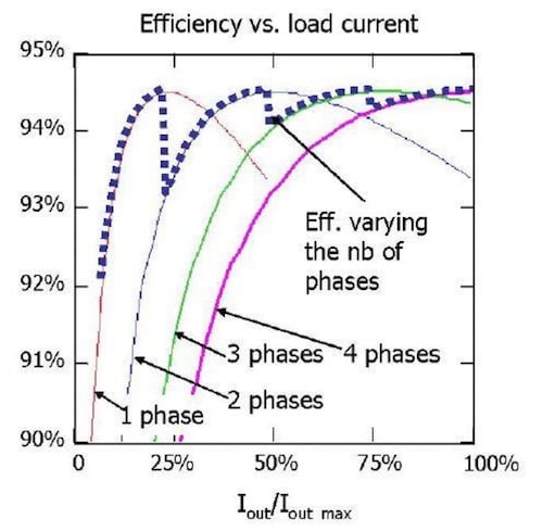 在低負載電流下,單相可實現(xiàn)效率,但隨著電流增加,效率終會降低,直到系統(tǒng)以兩相更高效地運行。這種模式一直持續(xù)到所有階段都處于活動狀態(tài)時達到效率。因此,即使由于高負載電流要求而并非嚴格需要多相,多相方法也帶來了提高效率的可能性,尤其是在電流消耗變化很大的系統(tǒng)中。