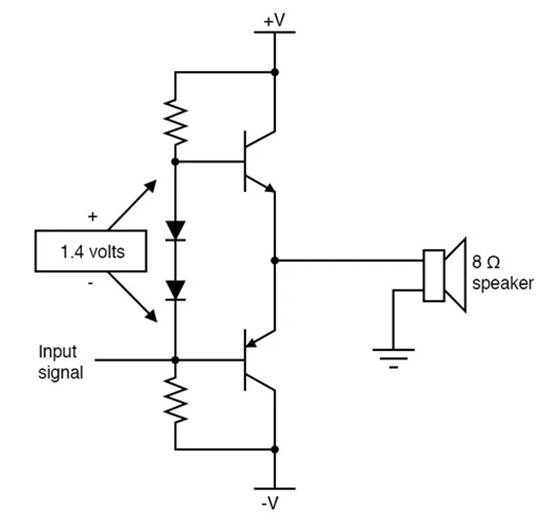 同時使用正電壓和負電壓電源的 B 類音頻放大器示意圖。