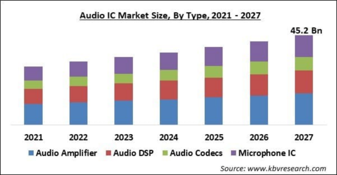 2021年,全球音頻芯片市場的收入規(guī)模為298.83億美元。隨著消費者對于音質要求的逐漸提高,個人便攜式電子產品、智能終端電子產品的更新換代,無線音箱的市場需求在逐步提升,受下游市場多元化需求的拉動,相應的音頻芯片需求也在逐步提升。根據Reportlinker預測,2022年至2027年,全球音頻驅動器IC市場將增長31.28億美元,在預測期內以15.86%的復合年增長率加速增長。