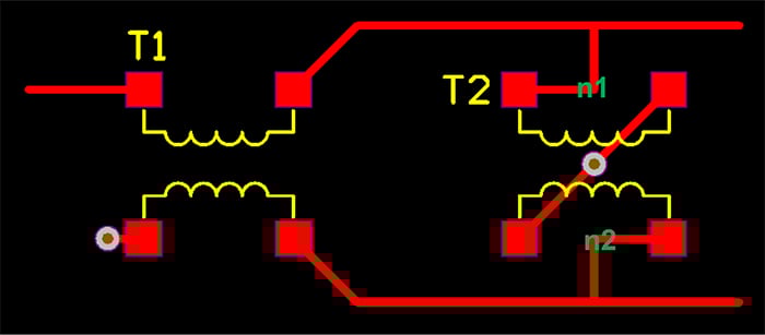 圖 5 顯示了該電路的另一種布局。在這種情況下,連接 T1 和 T2 的走線運(yùn)行到中點(上路徑為 n1,下路徑為 n2),然后連接到 T2 的相應(yīng)焊盤。這使得兩條路徑相同。此外,請注意對稱走線用于 T2 的兩個接地焊盤。