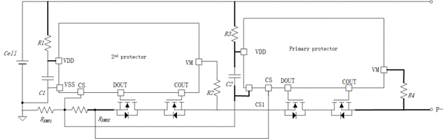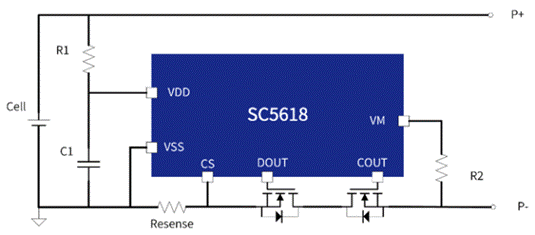 SC5618 系列保護(hù)芯片支持兩組芯片串聯(lián)使用,從而實(shí)現(xiàn)對(duì)鋰電池的初級(jí)保護(hù)和次級(jí)保護(hù),增強(qiáng)系統(tǒng)的魯棒性。