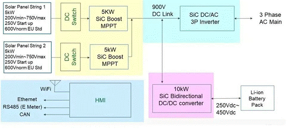 以10kw太陽能儲能系統(tǒng)為例,由艾睿電子推出的這款10kW DC/AC三相光伏逆變器將帶電池組和雙向充電系統(tǒng),主要由4個模塊組成,包括3相T型DC-AC逆變器塊、最大功率點跟蹤(MPPT)升壓模塊、雙向電池充電系統(tǒng)與人機界面(HMI)模塊等組成,可加速客戶的產(chǎn)品開發(fā)設計。