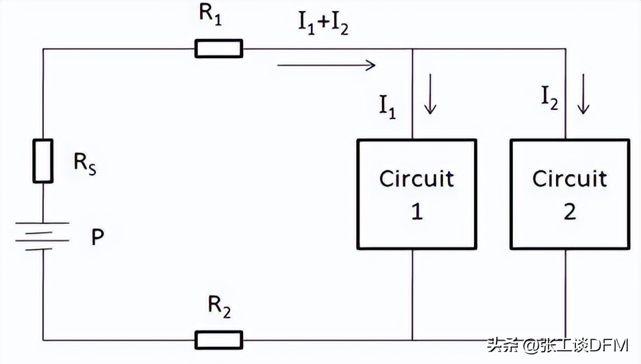 下圖顯示了通過(guò)共模阻抗進(jìn)行的噪聲去耦。電路1和電路2通過(guò)同一根導(dǎo)線獲得電源電壓的和接地環(huán)路。如果其中一個(gè)電路的電壓突然需要提高,另一個(gè)電路將降低,因?yàn)楣搽娫春蛢蓚(gè)回路之間的阻抗。
