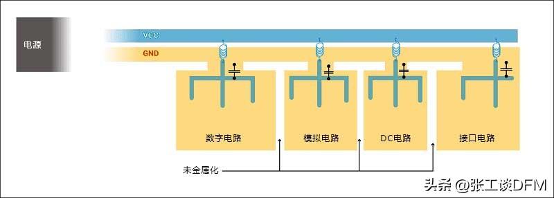 下圖說(shuō)明了如何使用分段將四個(gè)不同的電路分開(kāi)。地平面使用未金屬化的護(hù)城河/通道有效地隔離了電路。電感和電容對(duì)每個(gè)電路進(jìn)行濾波,電源層之間的耦合減少。